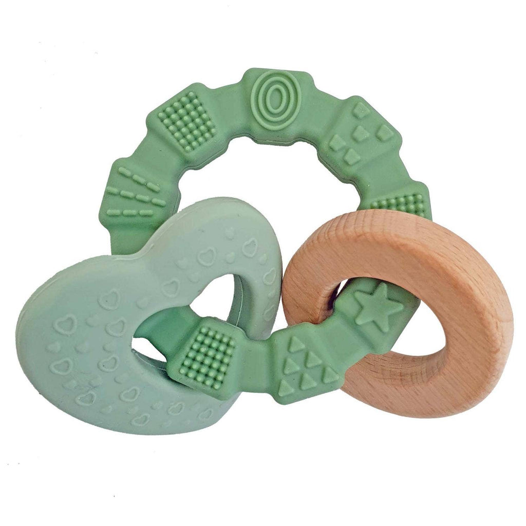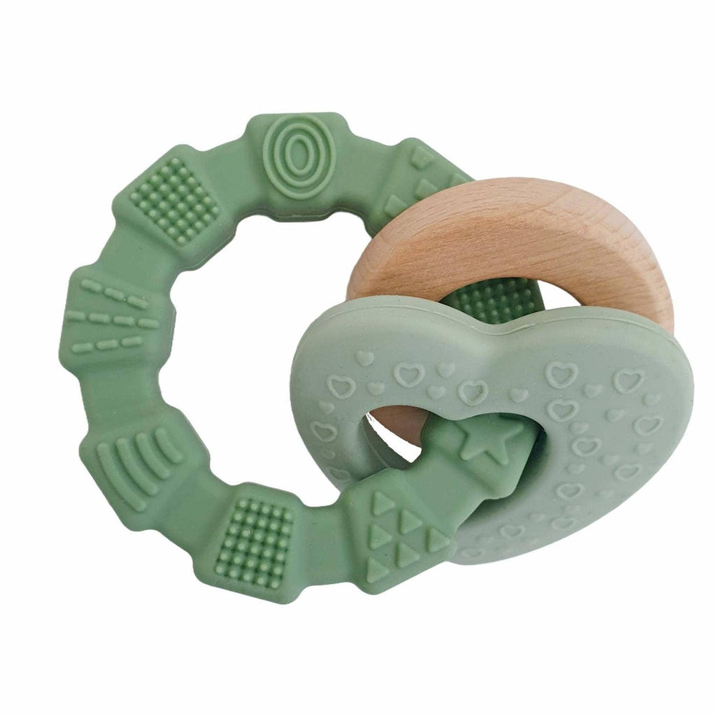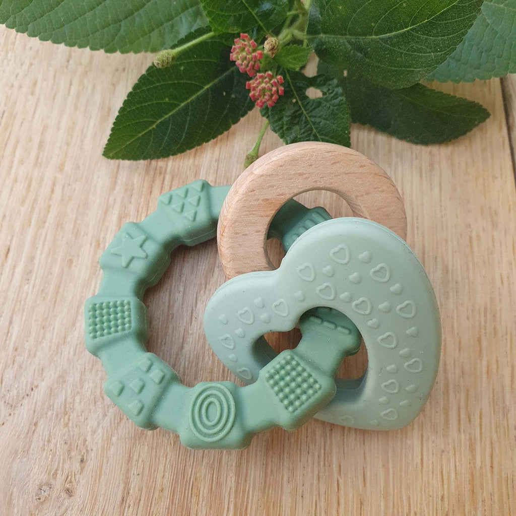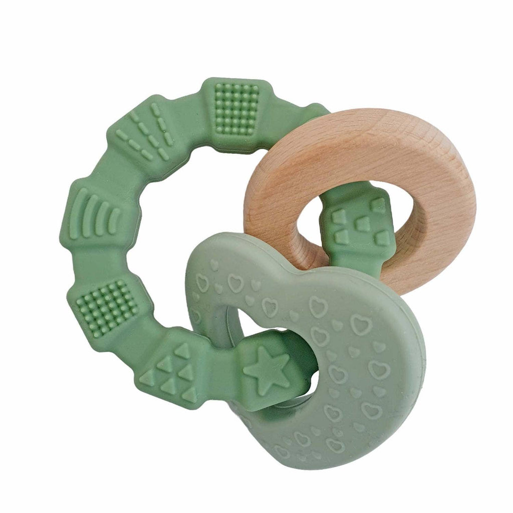 Ein Beißring aus Silikon und Holz, das das Baby leicht greifen, schütteln und daran kauen kann.