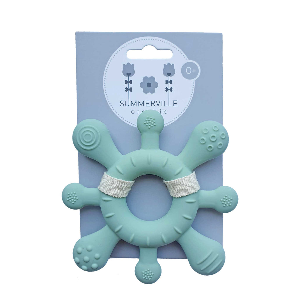 Beißring aus Silikon, das für das Baby interessant zum Erkunden ist und sich gut zum Kauen anfühlt.