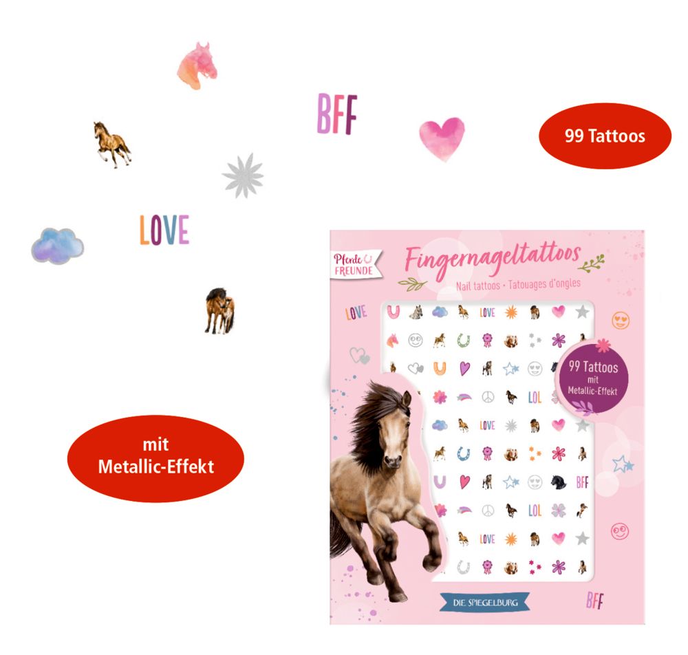 Pferdefreunde aufgepasst: Mit diesen 99 Fingernagel-Tattoos von Die Spiegelburg werden die Nägel zu einem echten Hingucker. Zauberhafte Pferde-Motive, coole Schriftzüge und einzelne Motive mit aufregendem Metallic-Effekt lassen die Nägel junger ReiterInnen strahlen und funkeln. Die kinderleichte Handhabung dieser hautfreundlichen Tattoos ermöglicht eine selbständige Nutzung, ganz ohne die Hilfe von Erwachsenen. Sie können spielend leicht mit etwas Seife und Wasser entfernt werden, für einen temporären Wow-Effekt! Ideal für Geburtstage, Partys oder als Highlight im Alltag – dieses Tattoo-Set ist ein zauberhaftes Geschenk für kleine und große Pferdefreunde