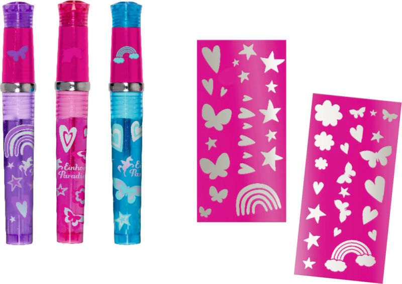 Kreativ im Einhorn-Paradies: Mit den glitzernden Tattoo-Stiften von Die Spiegelburg lassen sich zauberhafte Motive auf die Haut bringen. Das Set umfasst drei hautfreundliche Stifte und zwei Bögen mit Schablonen-Stickern, die eine Vielzahl von Einhorn-Motiven und magischen Mustern bieten. So werden kinderleicht schöne und präzise Ergebnisse erzielt.