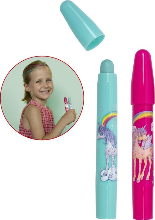 Farbzauber für kleine Einhorn-Fans! Die Haarkreide - Einhorn-Paradies von Die Spiegelburg bringt leuchtende Farben ins Haar – ohne dauerhafte Veränderung. Mit den zwei handlichen Stiftenlässt sich die Farbe spielend leicht auftragen und beim nächsten Haarewaschen einfach ausspülen. Die Verpackung mit schimmernder Holo-Folie sorgt für zusätzlichen Glanz – ein magisches Styling-Highlight für kreative Looks!