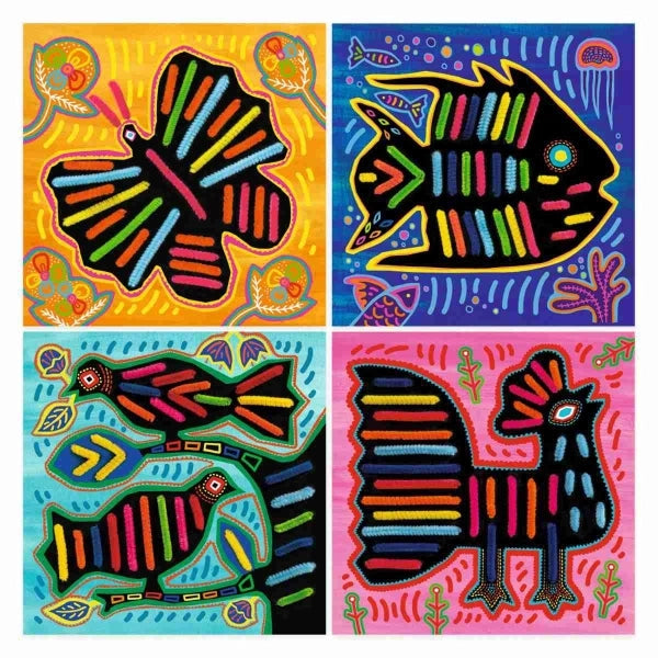 Eine manuelle Fädelaktivität mit vielen Chenillefäden. Das Kind zieht die Chenillefäden den Anweisungen im Erklärungsheft zufolge durch die großen Löcher in den Karten. Wenn die Karte ausgefüllt ist, wird sie zu einem wunderschönen bunten Bild, das von der südamerikanischen Kuna-Kunst inspiriert ist!