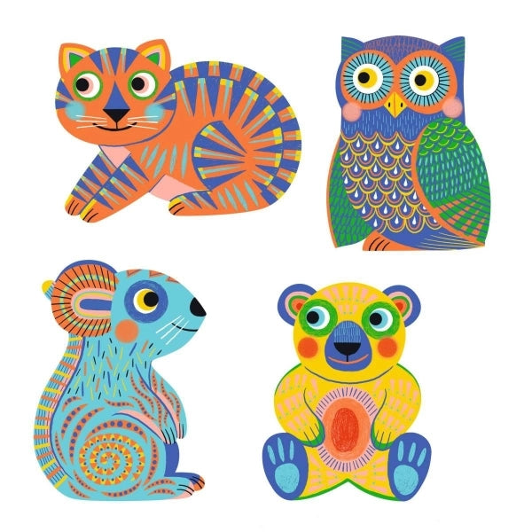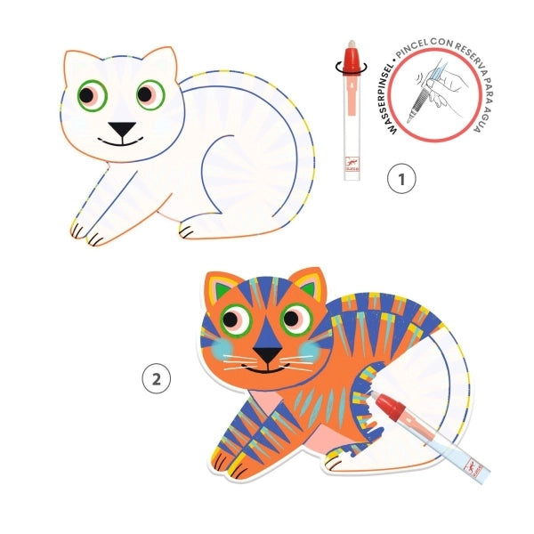 Ein Wassermalset für Kinder ab 18 Monaten. Das Kind malt die weißen Bereiche der Tiere mit dem Wasserstift aus, um herauszufinden, was sich dort versteckt. Wie durch Zauberei erscheinen die Motive und ändern ihre Farbe! Sobald die Vorlagen wieder trocken sind, kann das ganze Spiel von vorne beginnen!
