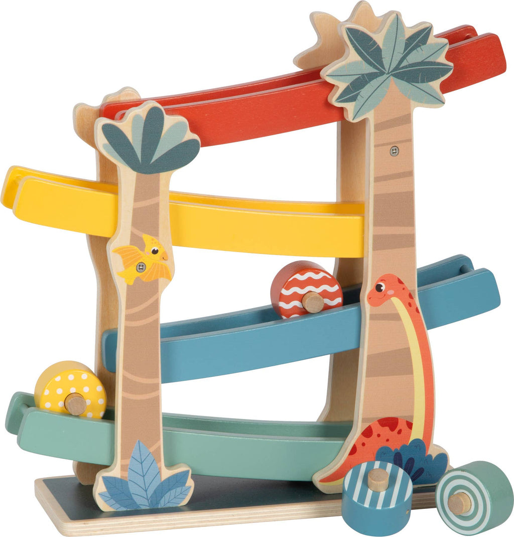 Mit Schwung durch die urzeitliche Dino-Welt! Diese Kugelbahn aus FSC® 100%-zertifiziertem Holz bringt rasanten Spielspaß ins Kinderzimmer, wenn die vier verschieden farbigen und mit Mustern verzierten Holzräder die vier Rampen hinuntersausen. Die robuste Rennbahn ist mit zwei niedlichen Dinos sowie Palmen und Blättern verziert. Besonders standfest durch breiten Standfuß! Ein echtes Highlight für alle kleinen Dino-Fans und ein Hingucker für jedes Kinderzimmer! Bei den Spielzeugen der Produktlinie „Dino“ dreht sich alles um die faszinierenden Urzeittiere, die Klein und Groß seit jeher in ihren Bann ziehen. Die Holzspielzeuge fördern die motorischen Fähigkeiten, regen die kindliche Kreativität und Fantasie an und animieren Kinder dazu, mehr über die Natur und die Geschichte der urzeitlichen Giganten zu erfahren.