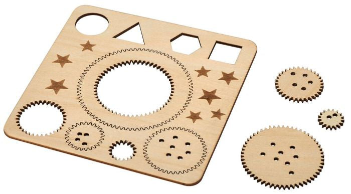 - Spirograph mit 5 Zahnrädern und 4 geometrischen Schablonen.