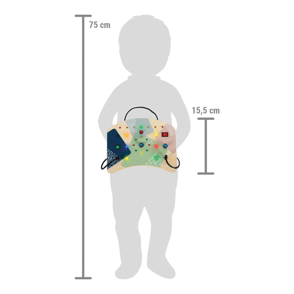 Das Motorikbrett LED Licht und Schalter aus hochwertigem Holz ist ein faszinierendes Lernspielzeug, das speziell entwickelt wurde, um die Neugier und Motorikfähigkeiten von Kleinkindern zu fördern. Mit einer Vielzahl von interaktiven Elementen bietet dieses elektronische Busy Board eine spannende Möglichkeit, die Welt der Elektronik sowie der elektronischen Schalter und Knöpfe spielerisch zu erforschen. Das Board ist mit verschiedenen Knöpfen, Dreh- und Kippschaltern, einem Zündschlüssel und einem Stecker ausgestattet. Der obere rote Knopf aktiviert eine faszinierende LED-Sequenz, die Kinder zum Experimentieren einlädt. Mit dem mittigen blauen Drehknopf kann die Geschwindigkeit, in der die LEDs im Kreis aufleuchten, angepasst werden. Das Motorikbrett, auch als Busy Board oder Activity Board bekannt, fördert intensiv das Verständnis für Ursache und Wirkung sowie die Feinmotorik und Hand-Auge-Koordination. Ein Batteriefach für 3 x AAA-Batterien befindet sich auf der Rückseite.