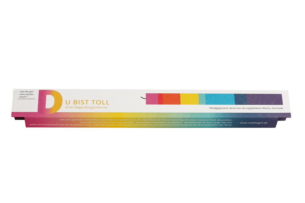 Die Kerzen sind aus durchgefärbtem Wachs, von Hand wird jeweils eine Farbschicht auf die nächste gegossen. Jede Kerze ist damit ein Unikat, perfekt als kleines Geschenk einzeln verpackt.
