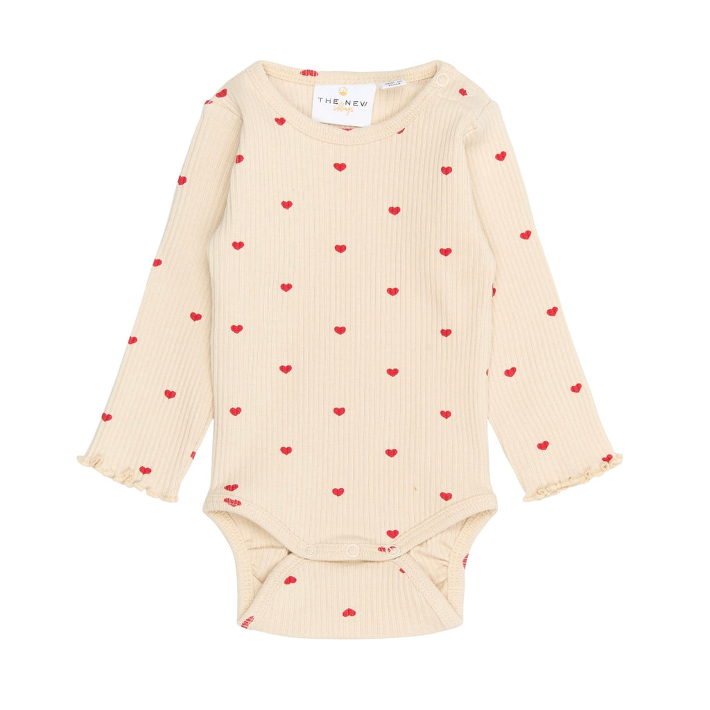 Dieser langärmelige Body von THE NEW Siblings ist sowohl süß als auch funktional – perfekt für die Kleinen. Er verfügt über einen Allover-Print mit kleinen Herzen und zarten Rüschen an den Ärmelrändern, was ihm einen charmanten und verspielten Look verleiht. Der Body wird mit Druckknöpfen an der Schulter und am Saum geschlossen, sodass er sich leicht an- und ausziehen lässt. Ideal für den Alltag und gemütliche Momente.