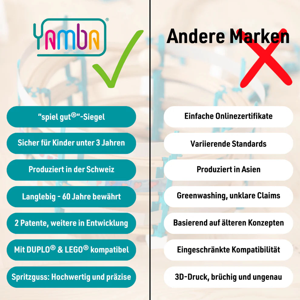 Alle Teile sind mit gängigen Holzeisenbahnschienen (BRIO®, IKEA®, Eichhorn®, Hape®, usw.) und Klemmbausteinen (DUPLO®, BioBUDDi®, Hubelino®, usw.) kompatibel.